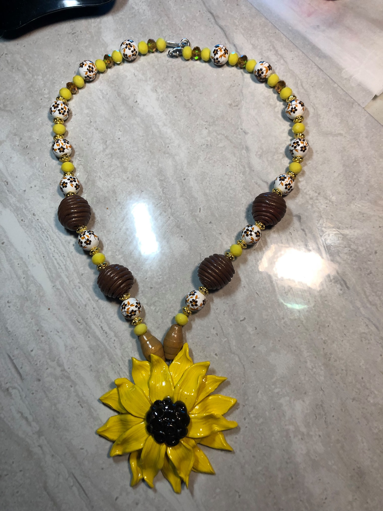 Yellow polymer clay sunflower with bee hive clay beads handmade. With matching beads to accent the pendant. Just awesome to wear with any outfit.